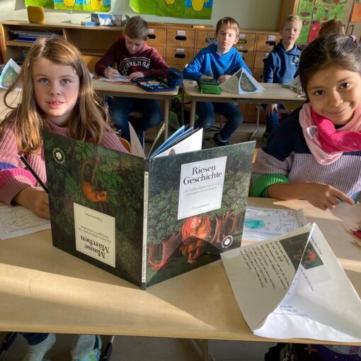 Unterwegs wurde ein alter Autoreifen entdeckt und gleich zum Spielen mitgenommen. Er war toll zu sehen, wie viel Spaß die Kinder damit hatten. Der Reifen wurde den Berg hinunter gerollt, es wurde vor ihm weggelaufen, über ihn geprungen, als Hulahoop-Reifen benutzt und schließlich bis zur Schule getragen.